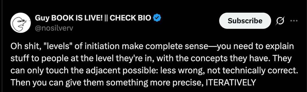 When communicating, it’s vital to tailor our message to the audience’s capacity. That’s why I write to you in depth, but my twitter posts are lossy.